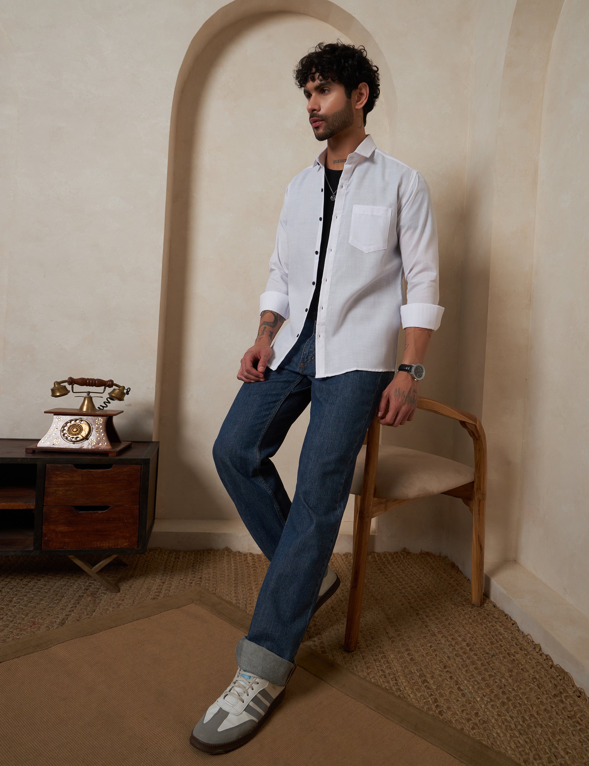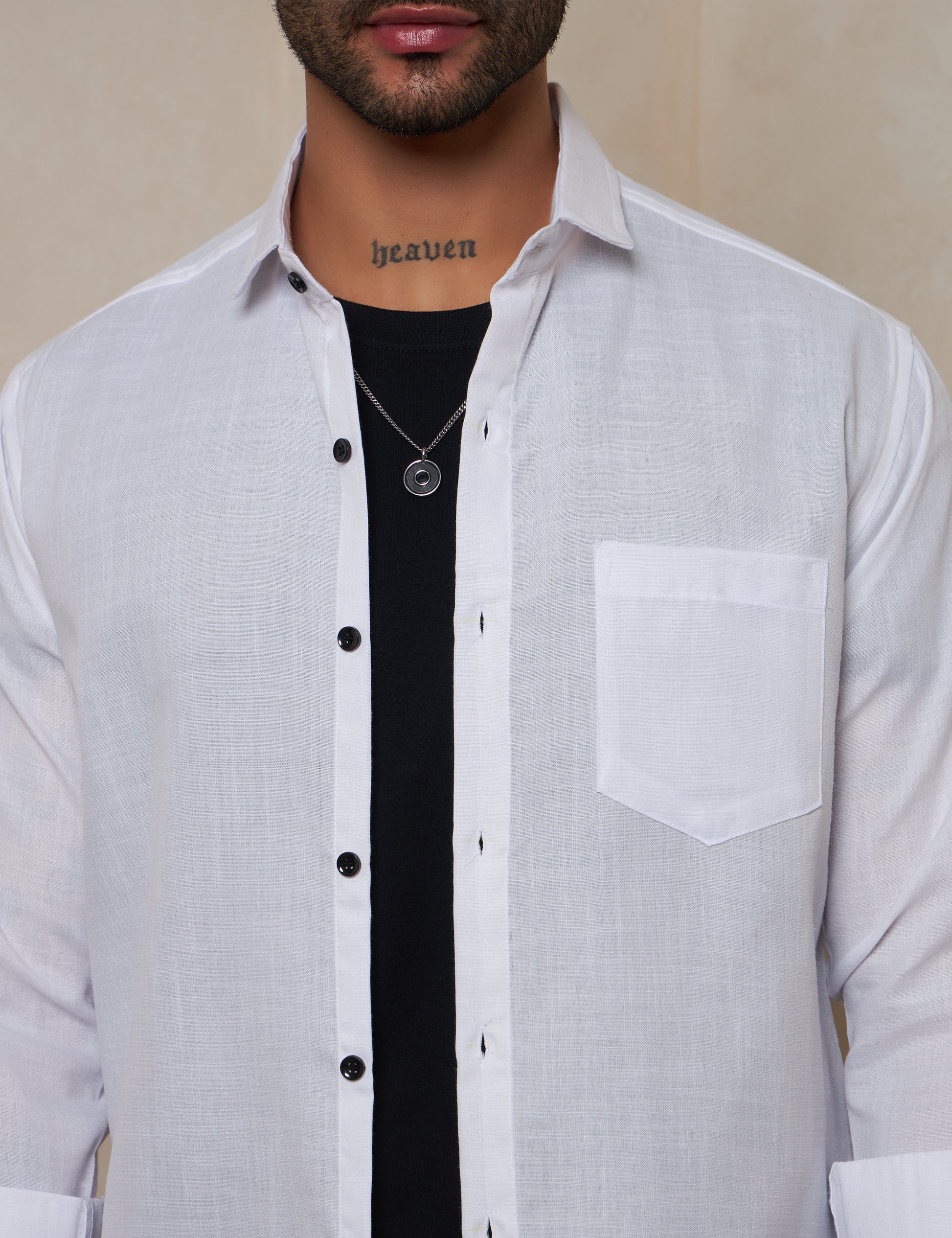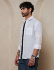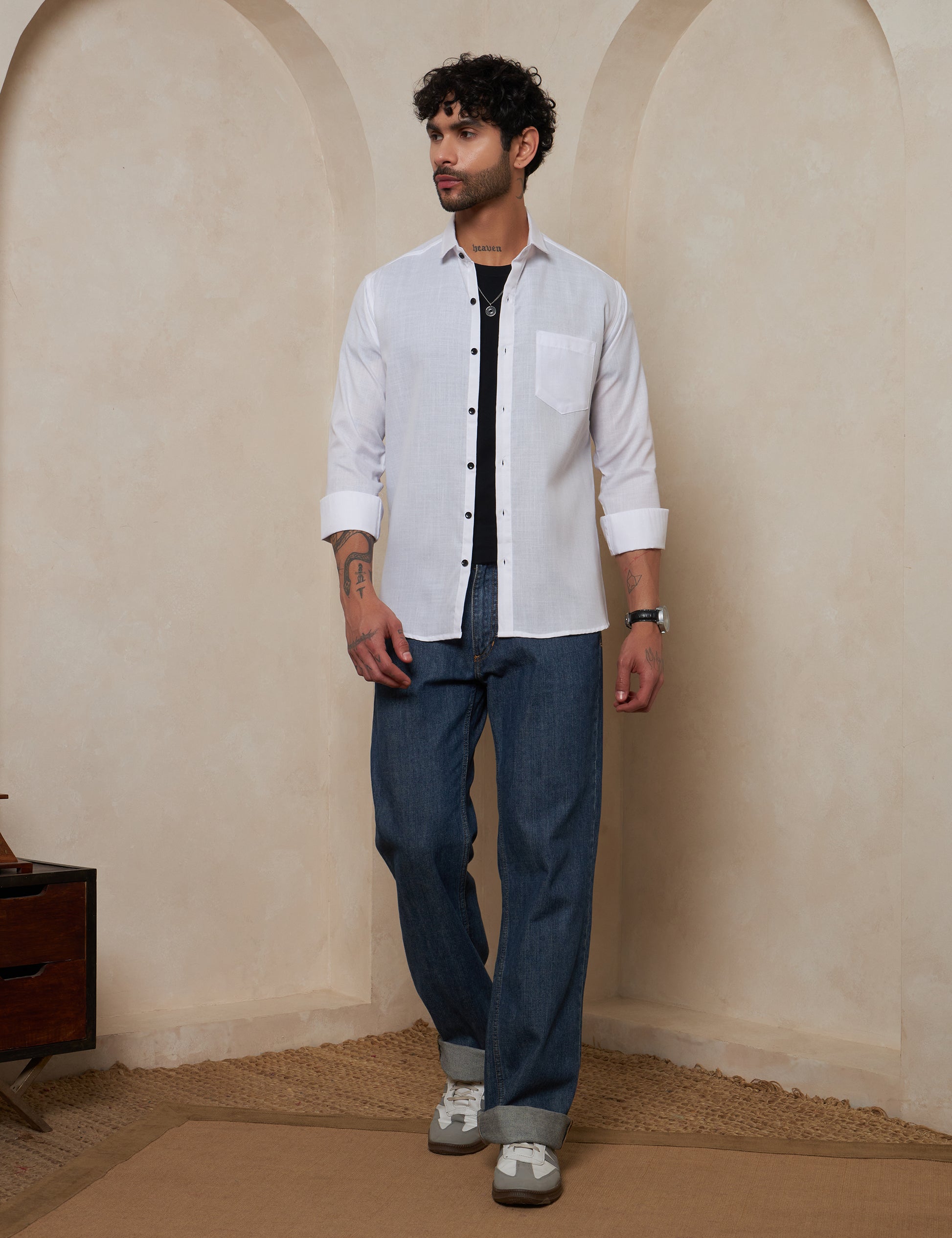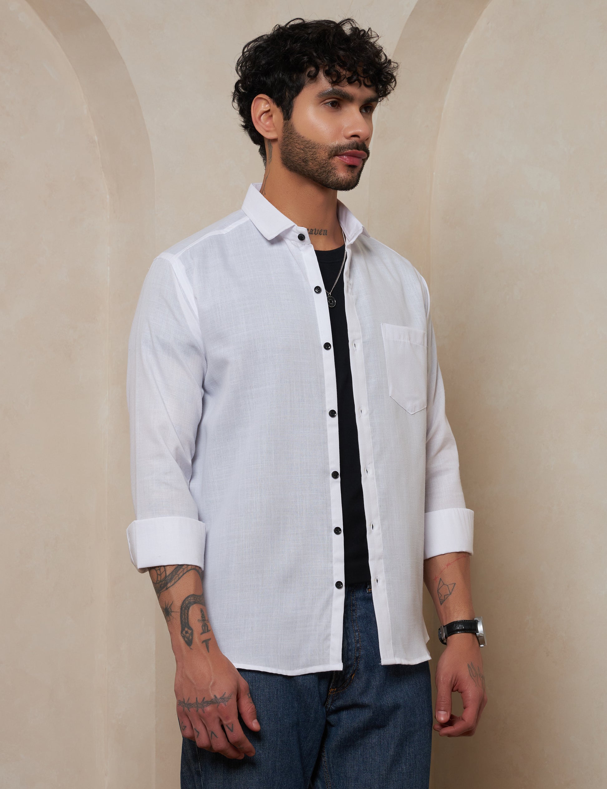 Men’s White Solid Linen-Look Casual Shirt with Contrast Buttons