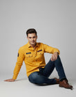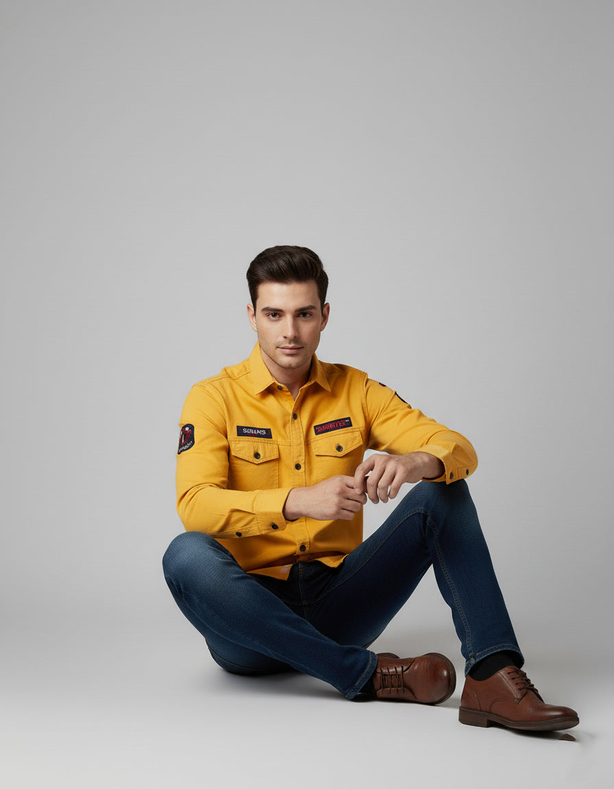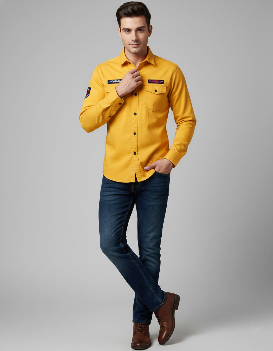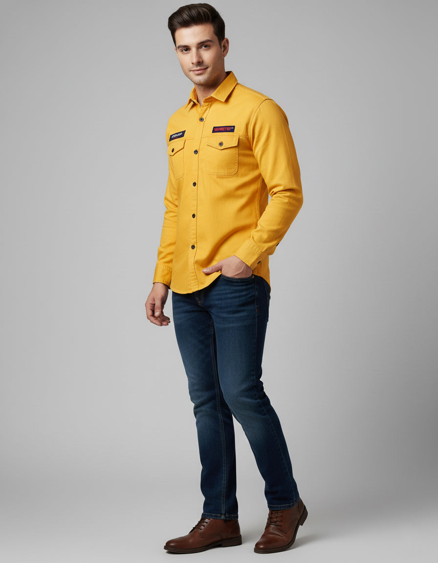 Men's Mustard Yellow Utility Shirt - Long Sleeve Slim Fit with Flap Pockets